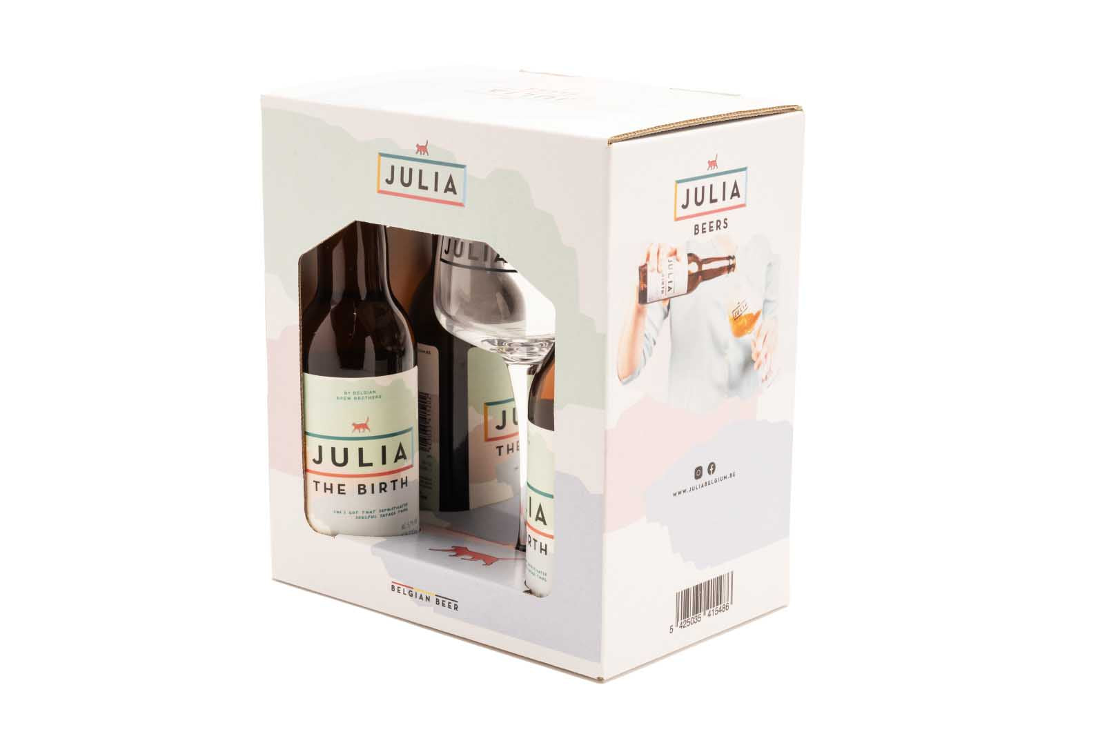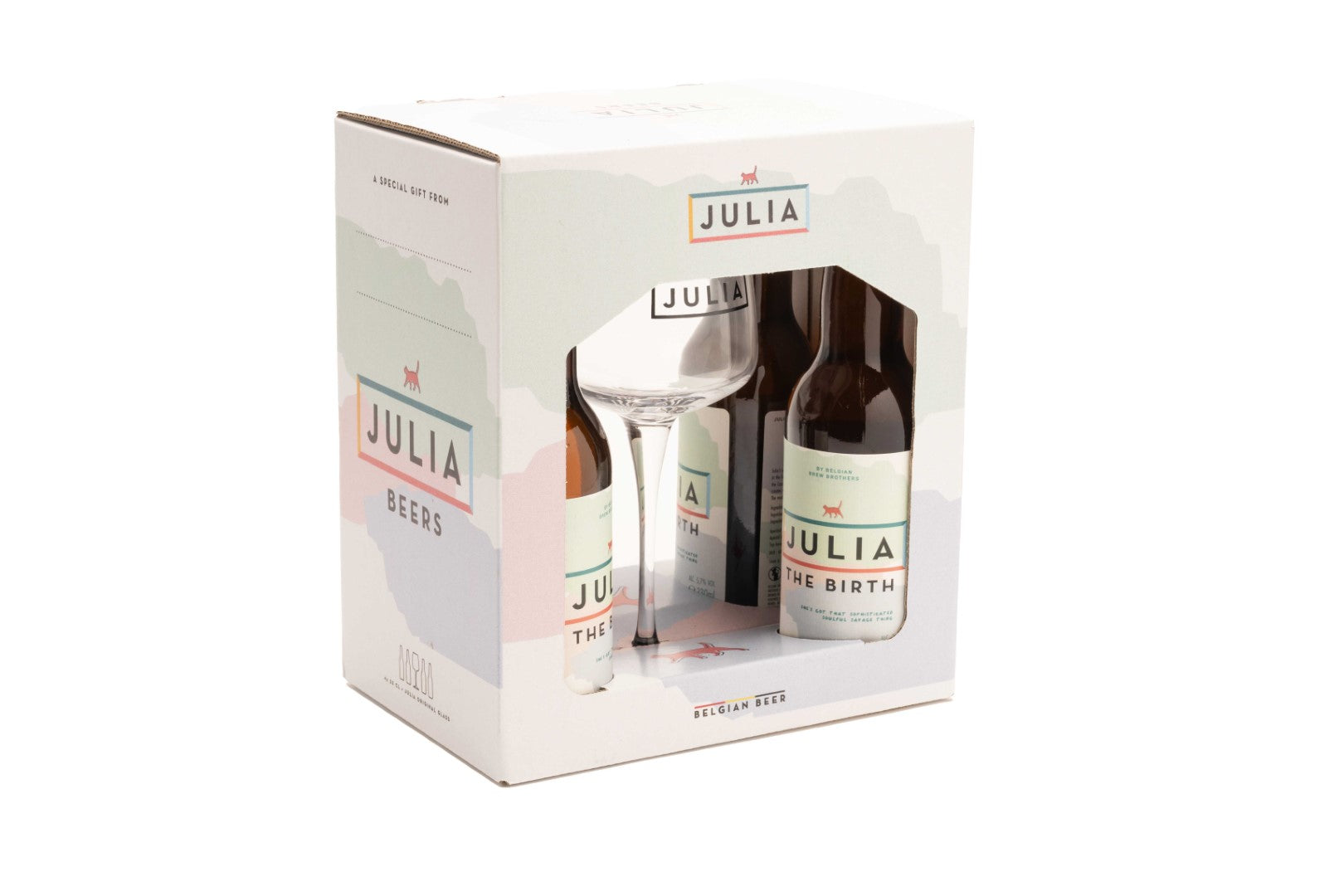 Een vrolijke geschenkbox met 4 Julia's van onze brouwerij, mét bijpassend glas! Maak iedereen blij met dit fantastische pretpakket!